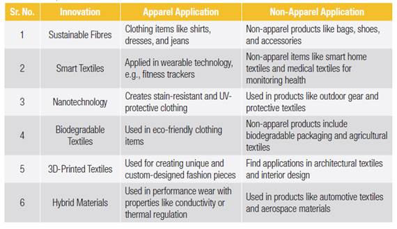 Table 1 shows applications of the innovations in textile raw materials for both apparel and non-apparel goods.