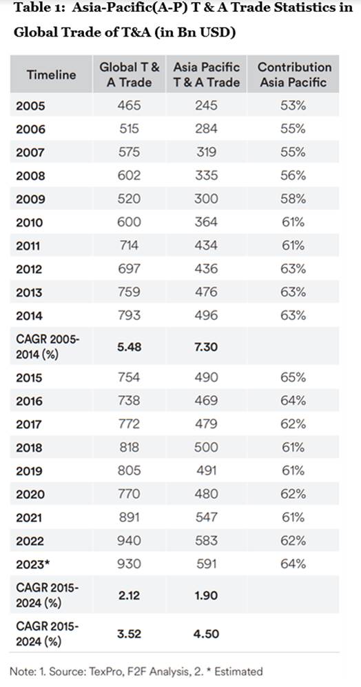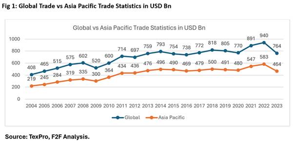 The Asia Pacific region has historically been a cornerstone in shaping the global trade of textiles and apparel (T&A), serving as a primary sourcing destination worldwide (Fig 1). Following the abolition of the Agreement on Textiles and Clothing (ATC) on January 1, 2005, the global T&A trade experienced rapid expansion, accompanied by increased exports from the Asia Pacific region. Notably, the growth rates in the Asia Pacific region have outpaced global trends, boasting a compound annual growth rate (CAGR) of 4.5 per cent over the last two decades, compared to the world's more sluggish average growth rate of 3.52 per cent during the same period.