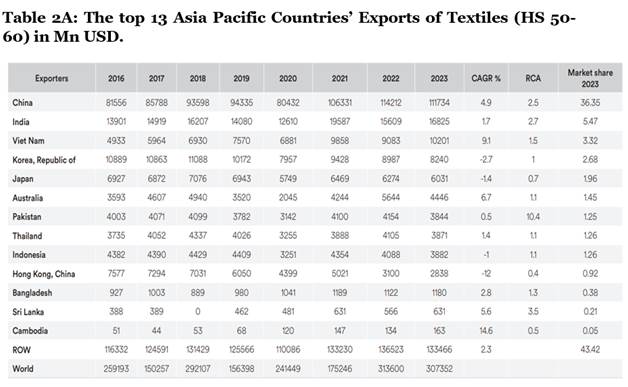 Considering all factors examined, it appears that Australia, China, India, and Vietnam possess a competitive edge or comparative advantage over other Asia-Pacific countries in the Textiles (HS50-60).