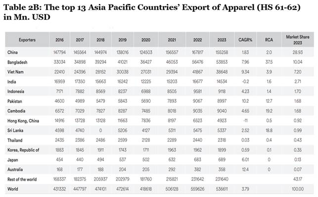 Below, we analyse the growth, competitiveness, and market shares of the top 13 countries in the Asia-Pacific region to better understand the dynamics of trade in textiles, apparel, and home textiles over 8 years. The countries under scrutiny include China, Bangladesh, Vietnam, India, Pakistan, Indonesia, South Korea, Hong Kong SAR, Cambodia, Japan, Thailand, Australia, and Sri Lanka. We segment the products into Textiles (HS 50-60), Apparel (HS 61-62), and Home Textiles (HS 63).