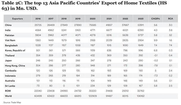 While several other countries hold less than 1.0 per cent market shares, notable among them are Thailand, Japan, Hong Kong, and Indonesia, which exhibit negative CAGRs, signalling challenges in their home textiles export sectors.