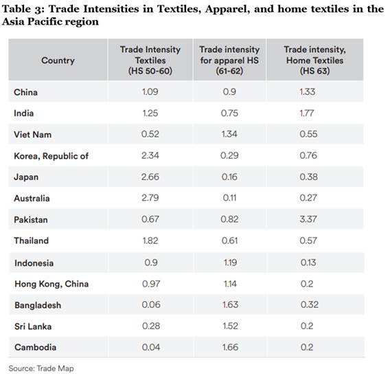 Table 3 records the Trade Intensity of the top 13 countries for three categories: Textiles (HS 50-60), Apparel (HS 61-62), and Home Textiles (HS 63). Trade intensity is typically measured as the ratio of a country's exports plus imports of a particular category to its world trade in that category.
