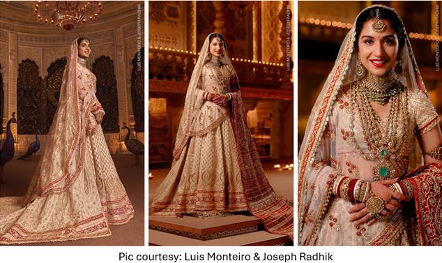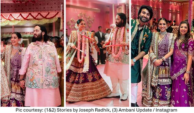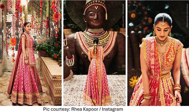 The lehenga itself was a masterpiece in vibrant rani pink bandhani, skilfully executed with the Rai bandhej technique on luxurious Banarasi brocade, embellished with intricate gold taar zardosi embroidery. Radiating sophistication and cultural richness, Radhika effortlessly blended tradition with contemporary allure, making a memorable impression at the ceremony.
