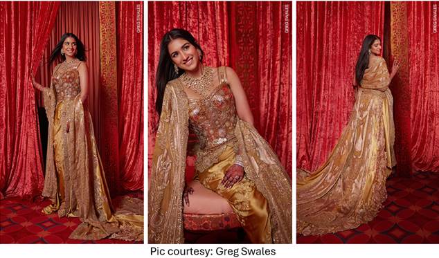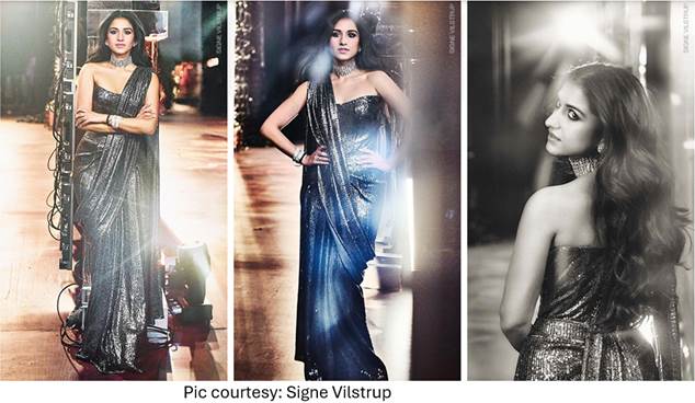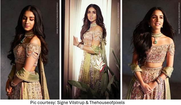 Complementing this glamorous look was a custom couture saree by Anamika Khanna, flawlessly blending traditional Indian elements with contemporary flair. The saree’s delicate embroidery and modern silhouette added a touch of cultural richness to Radhika’s reception attire, creating a harmonious fusion of global fashion influences. With her hair styled in soft waves and adorned with sparkling accessories, and a radiant makeup look that highlighted her natural beauty, Radhika epitomised modern elegance and grace on her special day.