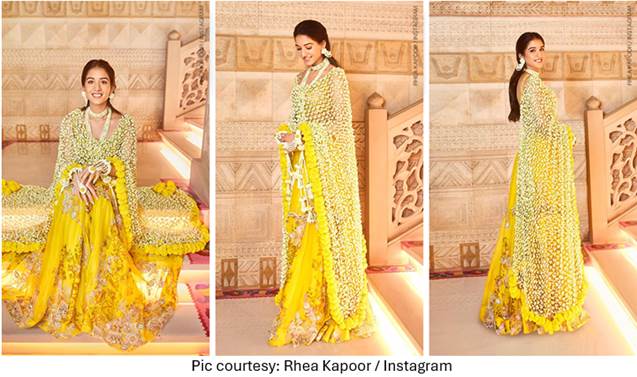 What truly set her look apart was the real phool dupatta draped gracefully over her shoulders, adorned with fresh flowers that exuded a fragrant charm. With her hair styled in loose curls and minimalistic makeup that accentuated her glowing complexion, Radhika epitomised timeless beauty and grace, making her haldi ceremony a moment of unforgettable charm and sophistication.